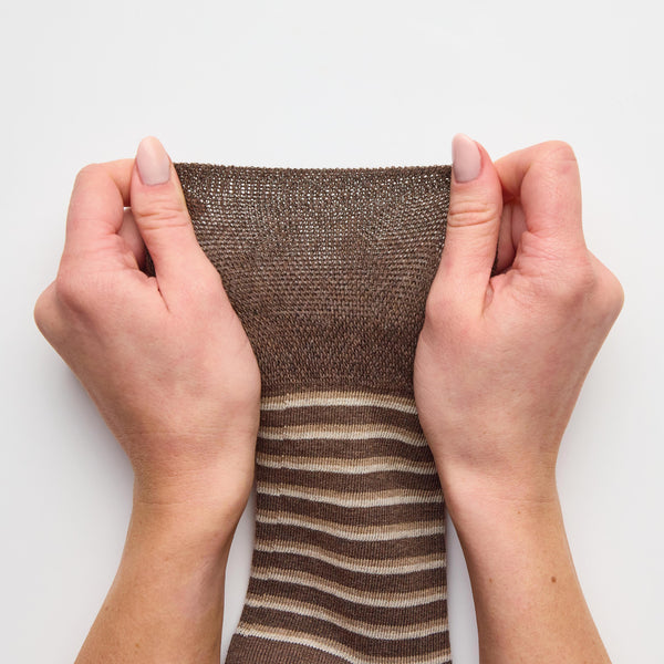Unsere Gentle Grip Litha Varied Stripe Baumwollsocken für Herren in Braun/Natur sind die ideale Lösung für alle, die normale Socken eng und unbequem finden. Diese bequemen Socken bestechen durch Streifen in verschiedenen Breiten in sattem Naturbraun und dezenten Neutraltönen, akzentuiert durch Weiß.