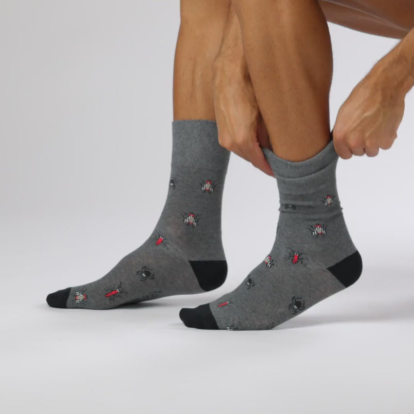 Our Men's Gentle Grip Fun Feet Cotton Socks in Bugs design are the number one solution for people who find regular socks tight and uncomfortable. These comfortable socks come in denim, navy and grey and include ladybugs, flies, spiders, ants and bumble bees.